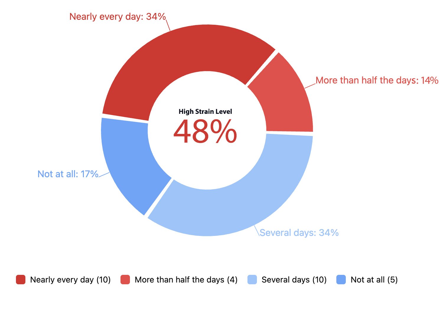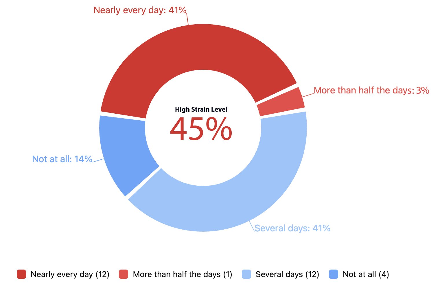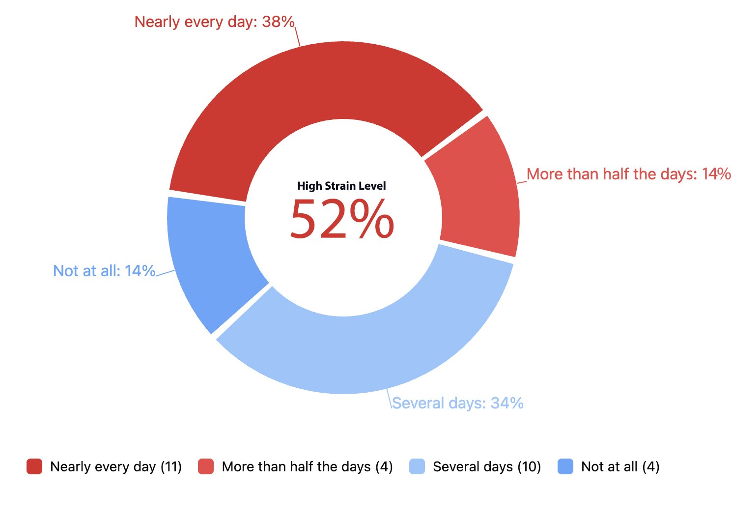 Note that Signal Levels reflect the overall weighted frequency of this experience, converted to a number out of 100 for easier interpretation. High Strain Levels show the proportion of people reporting this more than half the days or nearly every day, while Extreme Strain Levels highlight those experiencing it nearly every day — helping us understand both the overall pattern and how concentrated the strain may be within the group.