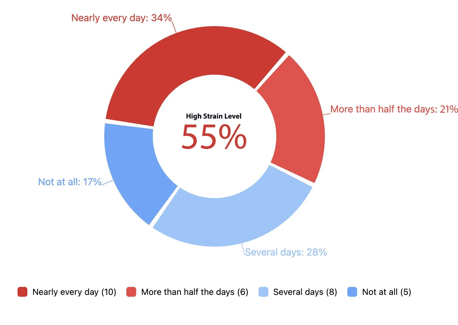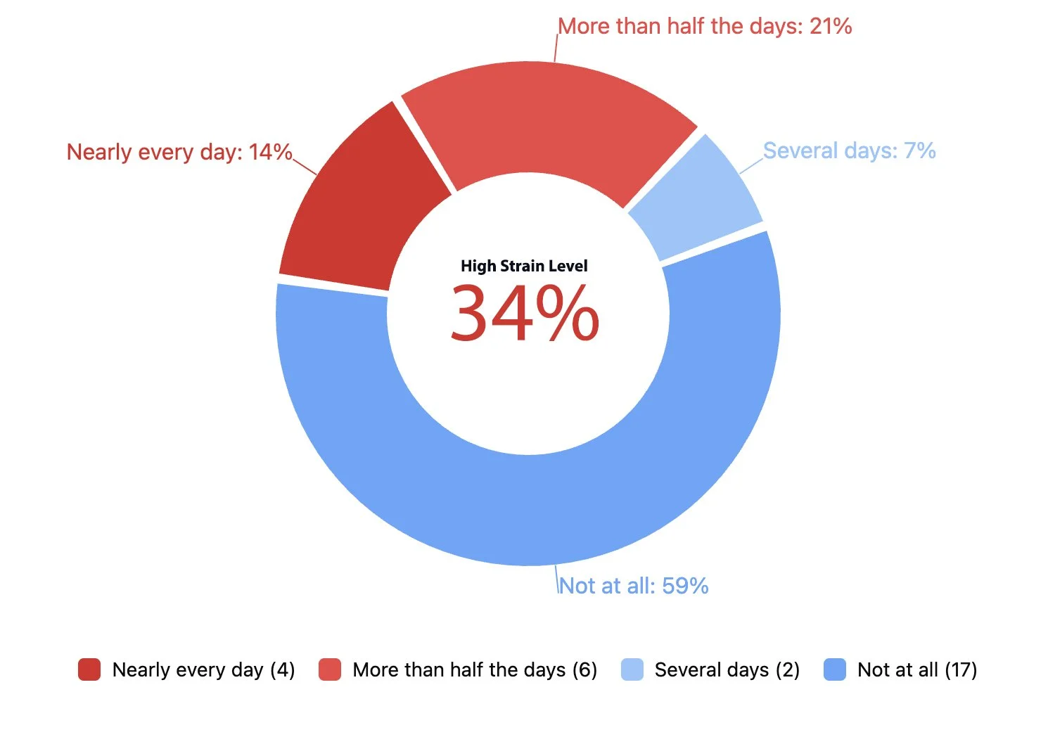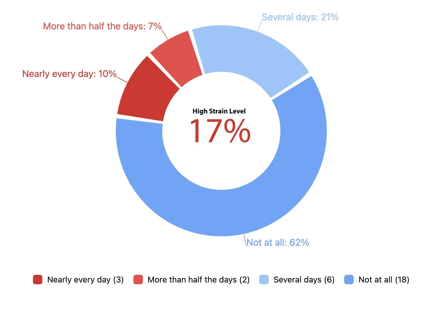 Note that Signal Levels reflect the overall weighted frequency of this experience, converted to a number out of 100 for easier interpretation. High Strain Levels show the proportion of people reporting this more than half the days or nearly every day, while Extreme Strain Levels highlight those experiencing it nearly every day — helping us understand both the overall pattern and how concentrated the strain may be within the group.