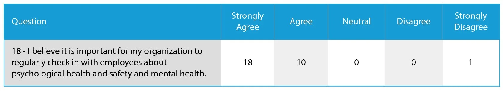 Question 18, our measure of readiness for ongoing measurement and dialogue, registered at 88, which is a strong endorsement. In plain terms, managers believe it is important to continue measuring and discussing psychological health and safety and mental health.