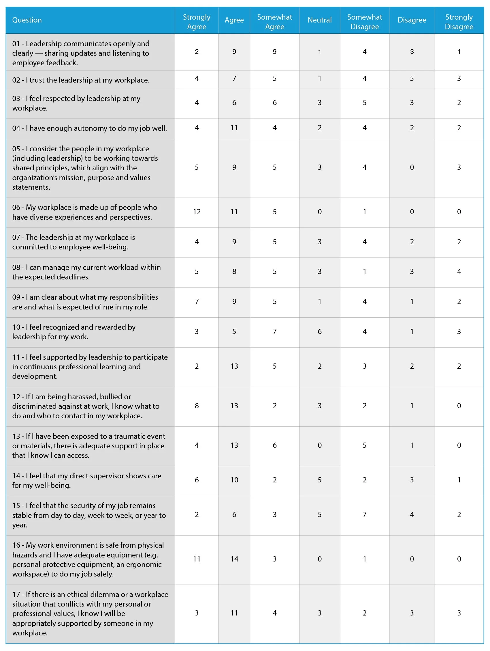 Questions 1–17 examine psychological health & safety conditions across Q2’s 14 Core PH&S Components. These components align with internationally recognized guidance (including ISO 45003), the Canadian National Standard for Psychological Health and Safety in the Workplace, and regional expectations reflected in WorkSafe BC’s direction on psychological injury prevention. Together, they assess, among other things, leadership behaviours, communication patterns, workload structures, role clarity, interpersonal safety, and reporting systems that shape day-to-day work experience.