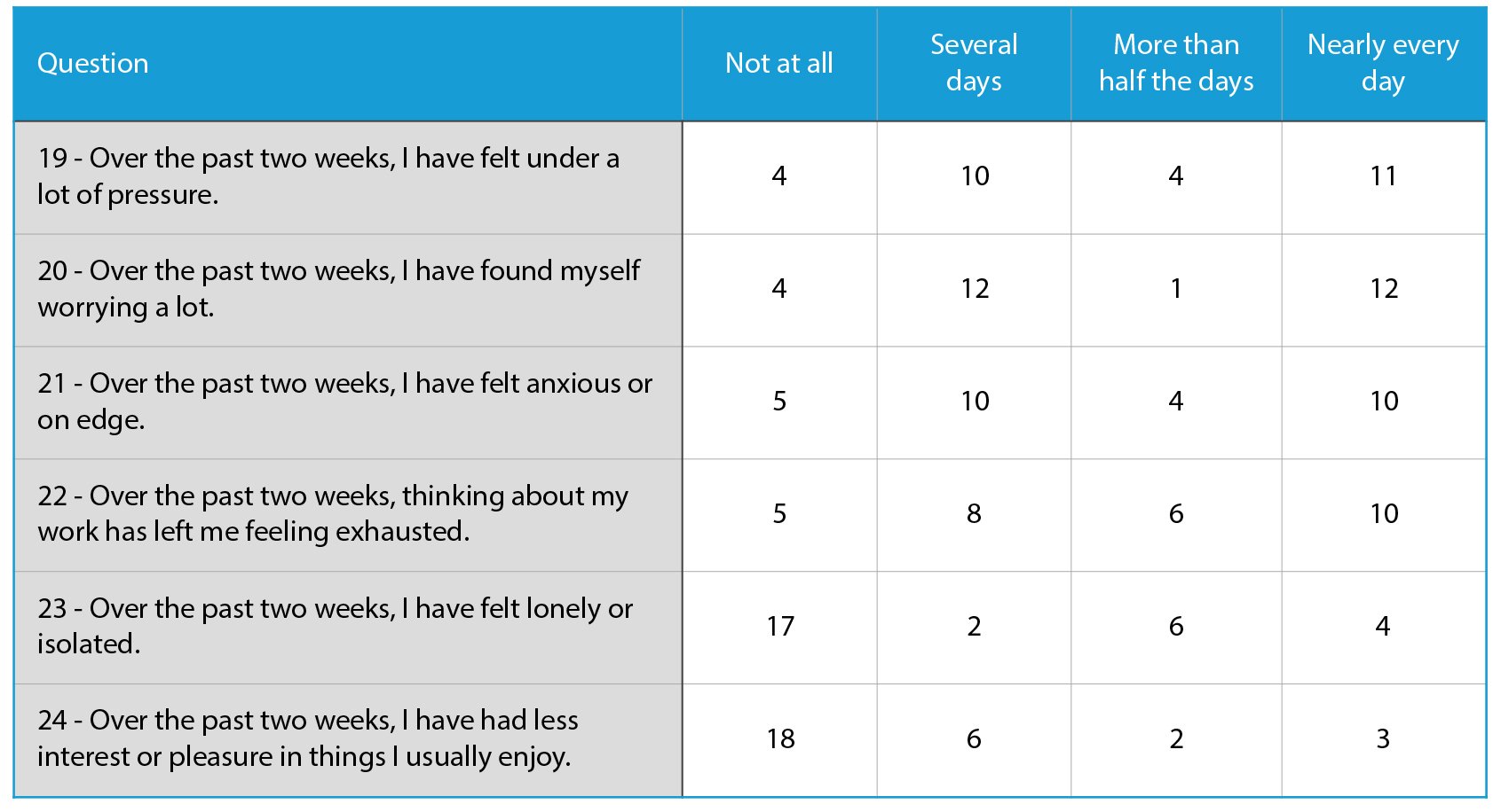 “Over the past two weeks, thinking about my work has left me feeling exhausted.” (Q22)